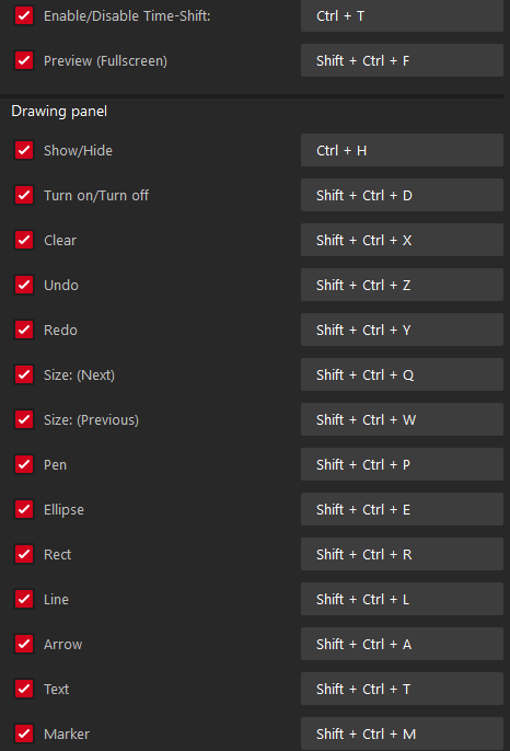 - Configurable hotkeys for drawing panel tools (marker, ellipse, rectangle, text...) and functions (undo, redo, clear...).