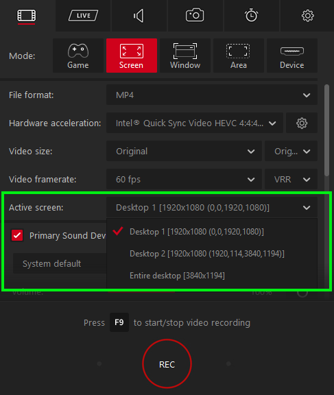 - Added "Entire desktop capture" to Active Screen list. This allows easy capture of all monitors in a single video using "Screen" mode