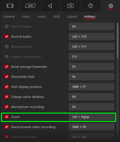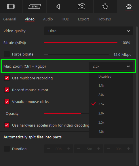 - Added real time video zoom that is following mouse cursor position. You can set the zoom amount in Settings-Video using "max. Zoom list". The default hotkey for turning zoom on/off is CTRL+PGUP and can be customized in hotkeys tab. When zoom is activated you will see a yellow frame around your screen